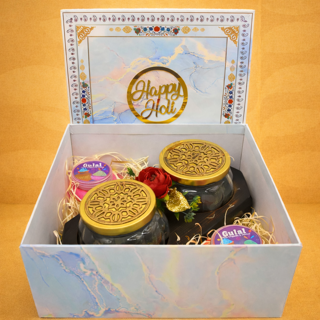 Celebrate Holi with elegance and thoughtful presentation through this refined festive hamper. Housed in a beautifully crafted marble-finish CAPA box (9.25 x 9.25 x 4.5 inches), this gift set blends modern aesthetics with traditional celebration essentials.