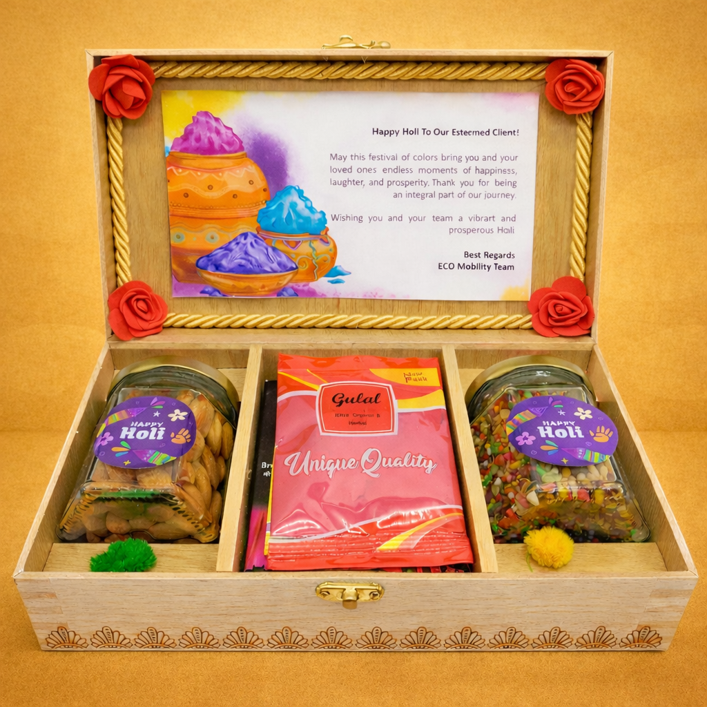 This Holi, gift the joy of flavors, colors, and heartfelt celebration — beautifully packed in a premium wooden keepsake box.