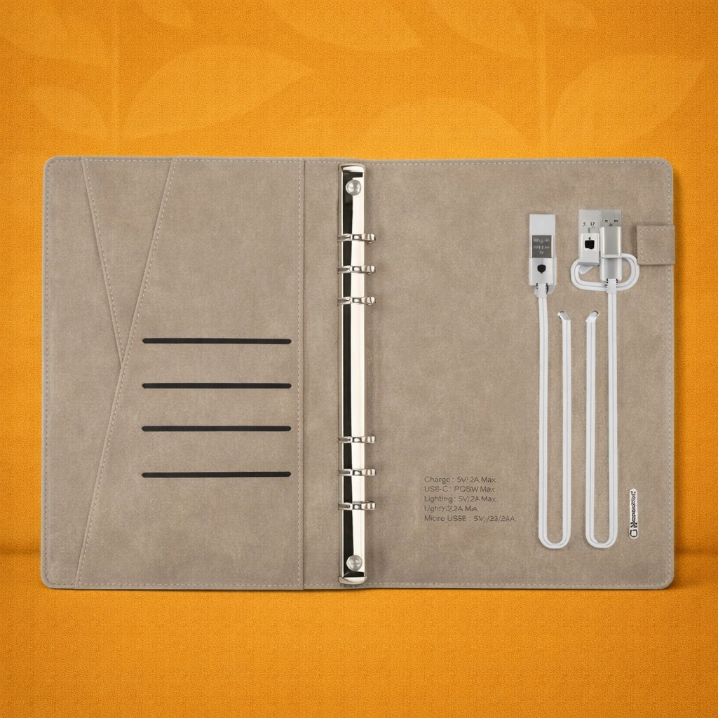 Designed for professionals who value organization and efficiency, the A5 Wireless Powerbank Folder is a smart blend of technology and functionality. Crafted with a sleek light-tan soft PU finish, this executive folder integrates a powerful 8000 mAh power bank with wireless charging capability, ensuring your devices stay powered throughout the day while you stay organized.