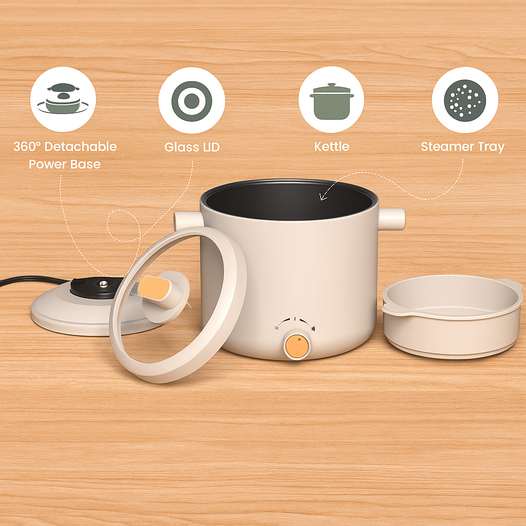 The Any Meal Electric Multi Cooker is a versatile 2-in-1 kitchen companion designed for convenience and efficiency. With a 1.5L capacity, dual heat settings (300W & 600W), and a 360° swivel charging base, it makes preparing daily meals quick and hassle-free. It comes with a cool touch handle, glass lid, detachable base, and a steamer tray, allowing you to boil, steam, or cook a wide variety of items like noodles, corn, eggs, pasta, or soup. Whether you’re steaming on the top tray or cooking in the main pot below, this sleek, space-saving cooker is ideal for home or office use.