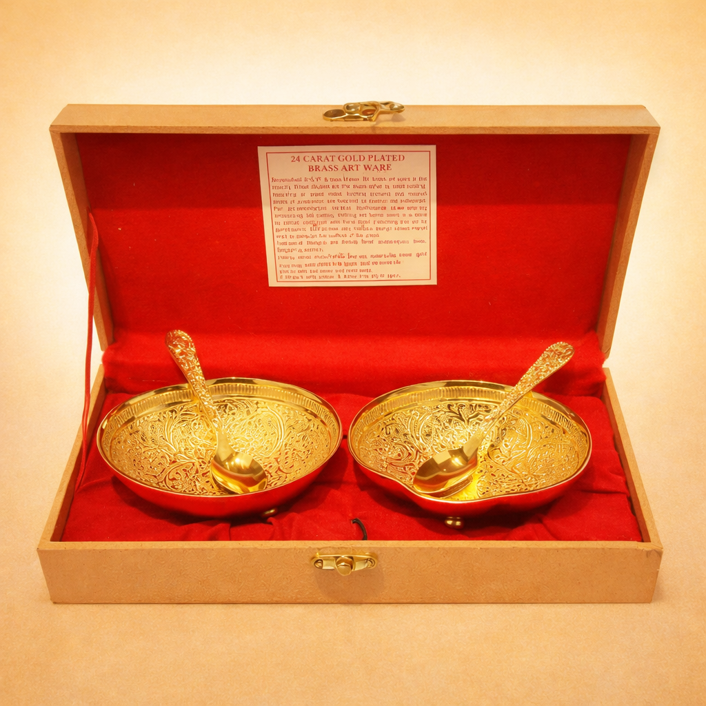 Brass Gold Plated Bowl with Spoon – 4 Pcs Luxury Serving & Gifting Set