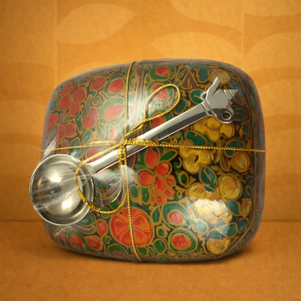 Presented in an exquisitely handcrafted decorative container, adorned with vibrant traditional motifs and paired with a stainless-steel spoon, this offering blends heritage artistry with premium indulgence. The packaging itself transforms the tea into a keepsake — ideal for festive gifting, executive hampers, and refined corporate collections.