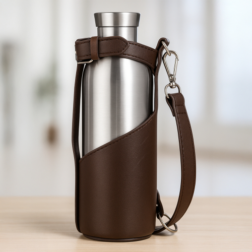 Inside, a brushed steel bottle, wrapped in deep mocha leather, stands tall—not just to quench, but to carry presence. With its artisanal cross-sling, it’s less bottle, more travel companion. Think minimalism meets mobility. Think alpine drives. Think sunset hikes where form meets function.