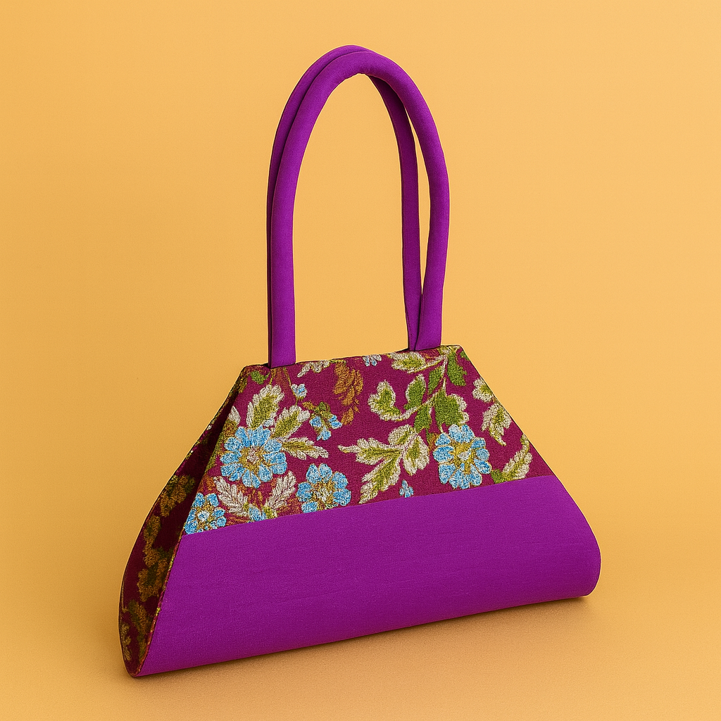 The Elegant Floral Brocade Ethnic Handbag – Purple Edition is a striking fusion of tradition and modern design. Crafted with rich brocade fabric featuring vibrant blue and green floral motifs, this handbag exudes timeless elegance. The lower half and handles are wrapped in a deep, royal purple fabric that adds sophistication and balance to the bold, ornate top panel. Its unique trapezoid silhouette gives it a distinctive festive charm, perfect for ethnic wear, celebrations, and gifting.