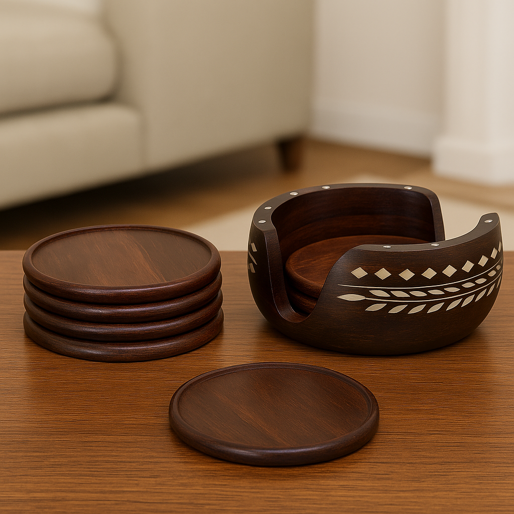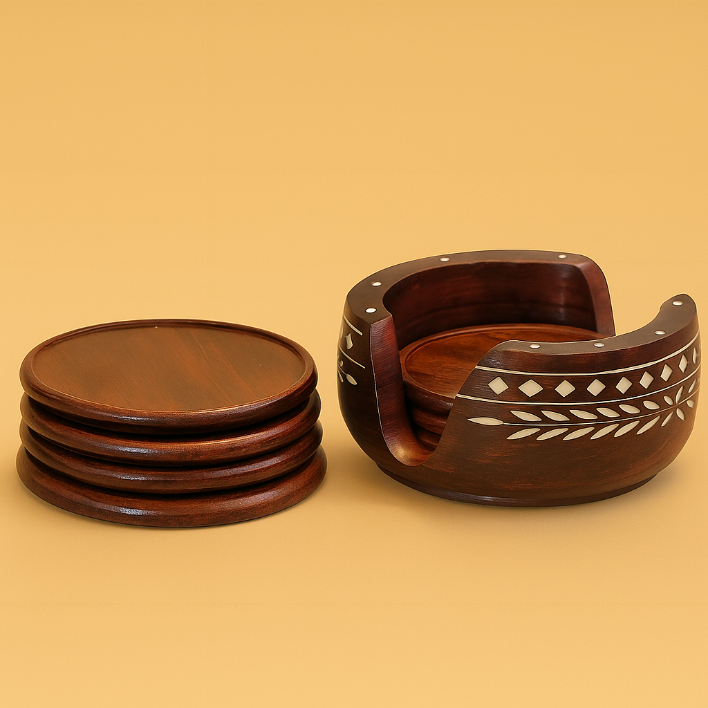 Add a touch of elegance to your table setting with this Handcrafted Wooden Coaster Set, beautifully designed to blend functionality with timeless artistry. Each coaster is carved from premium quality wood, polished to a smooth finish that highlights its rich natural grain. The accompanying holder features intricate hand-inlaid motifs, reflecting traditional craftsmanship that brings warmth and sophistication to any home décor.