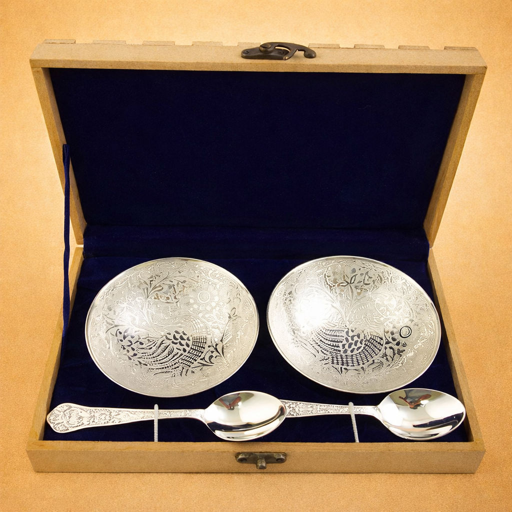 The bowls are finished with durable silver plating, offering a refined shine, long-lasting beauty, and easy maintenance. Designed for both elegance and functionality, this versatile set is suitable for daily domestic use as well as festive serving and décor.