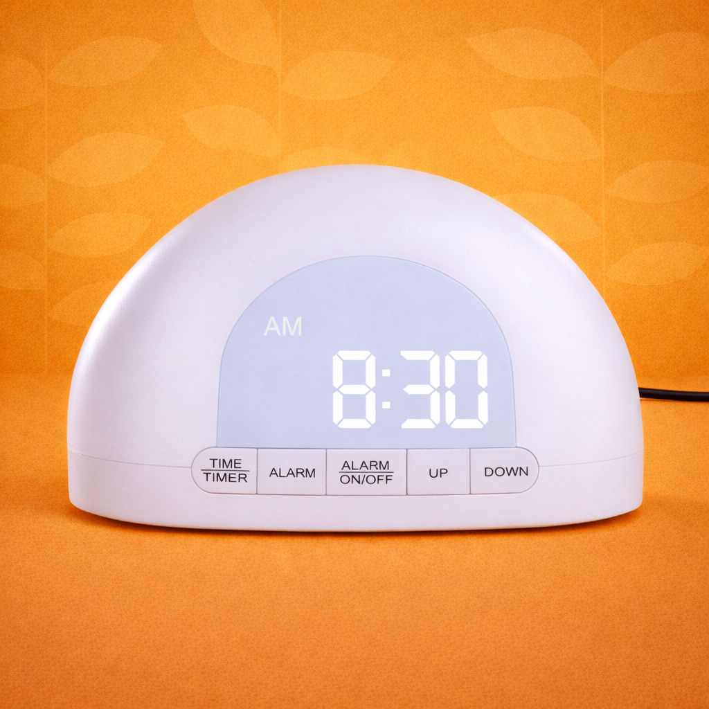 Perfect for bedside tables, this sunrise clock combines soothing lighting and practical alarm features for a refreshed morning routine.