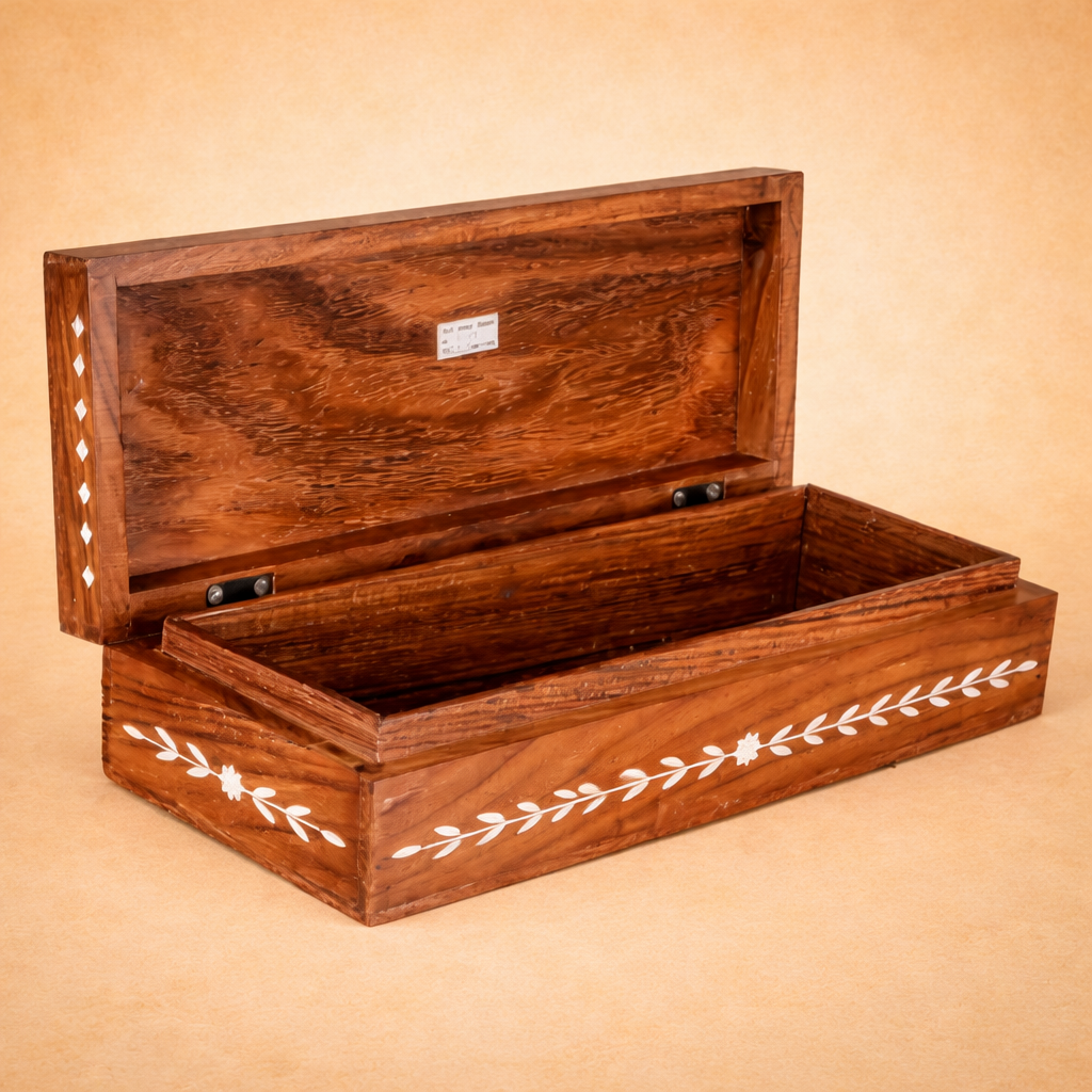 Crafted from premium seasoned Sheesham wood (aged for over a year for enhanced durability), this box combines strength with delicate artistry. The fine white acrylic inlay work contrasts gracefully against the rich, dark grain of Sheesham wood, creating a sophisticated and visually striking finish.