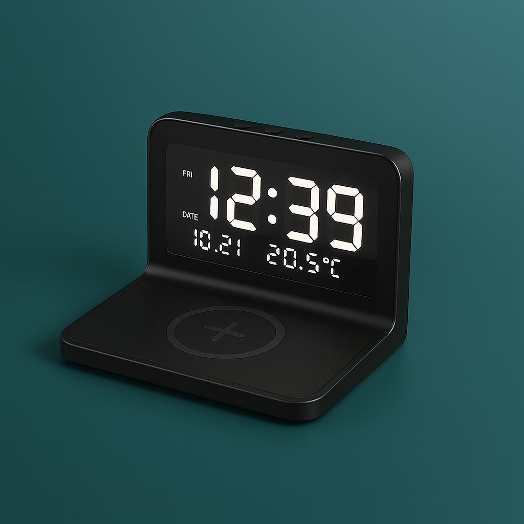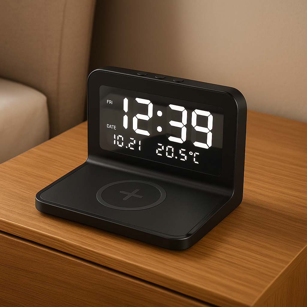 The LumiCharge Pro is a modern multifunctional clock designed to streamline your workspace and elevate your daily routine. With a sharp LED display that clearly shows time, date, day, and room temperature, this device offers more than just timekeeping. It blends technology and utility seamlessly with its innovative wireless charging base, allowing you to power up your phone effortlessly while you work or sleep.