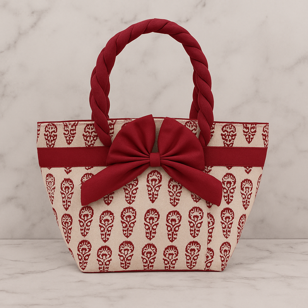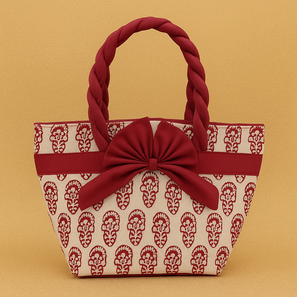 The Luxury Collection Handcrafted Bow Tote Bag is an elegant blend of heritage craftsmanship and modern design. Featuring a soft cotton canvas with intricate hand-block prints, it is accentuated by a statement maroon bow that adds a feminine charm. The braided handles enhance its premium look, offering both comfort and sophistication for daily or festive use.