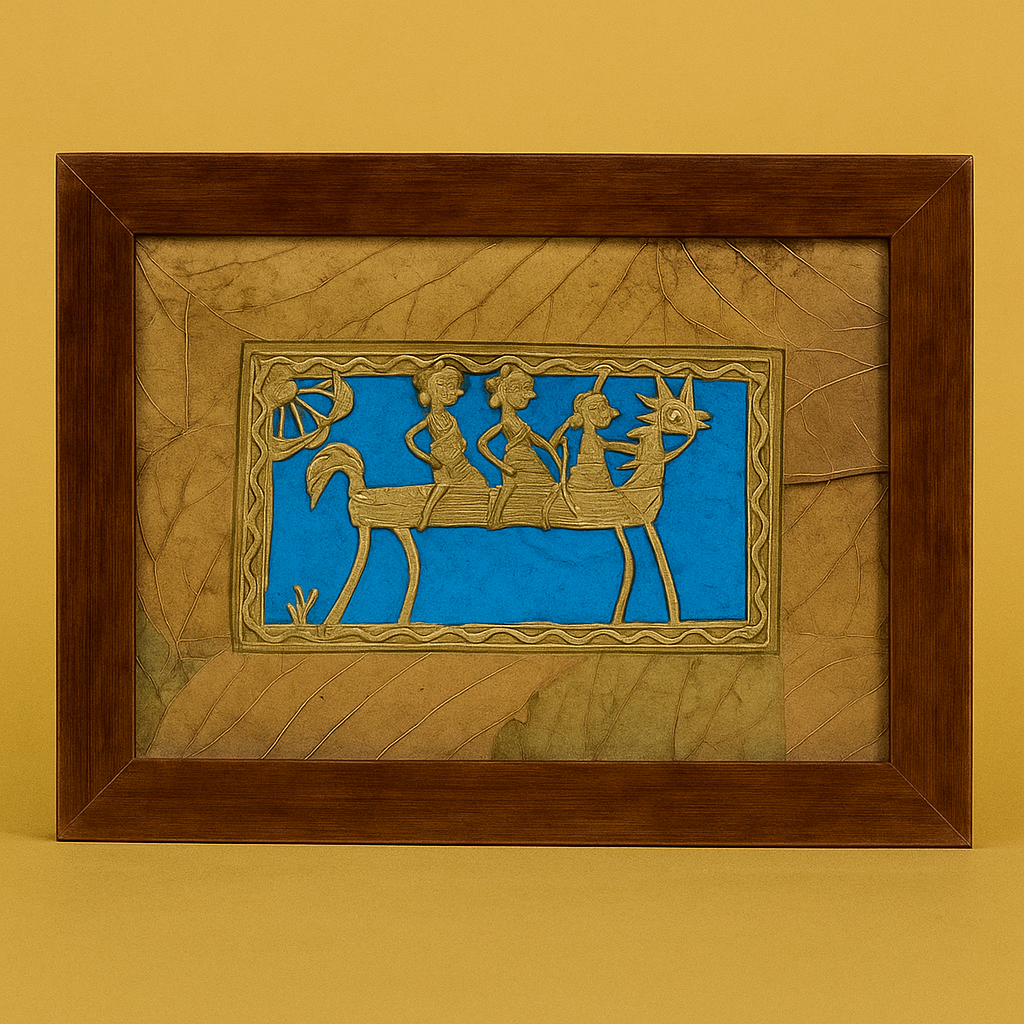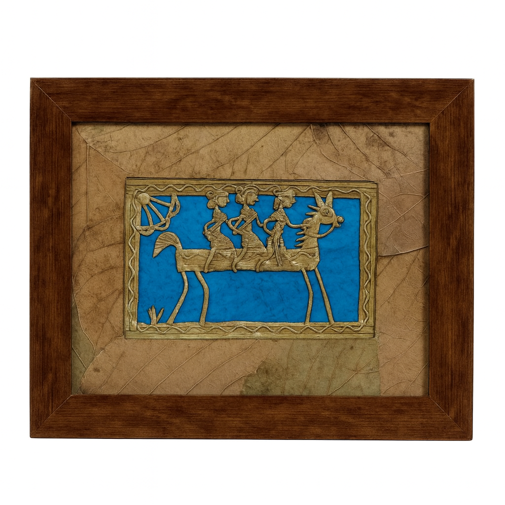 The Luxury Collection Handcrafted Dhokra Wall Frame is an elegant fusion of tribal tradition and artistic sophistication. Showcasing intricate Dhokra metalwork on a vibrant blue backdrop, this piece highlights India’s ancient lost-wax casting technique. The rustic brass tones, combined with a natural leaf-textured background and a rich wooden frame, create a striking contrast that enhances any space — from modern offices to classic home interiors.