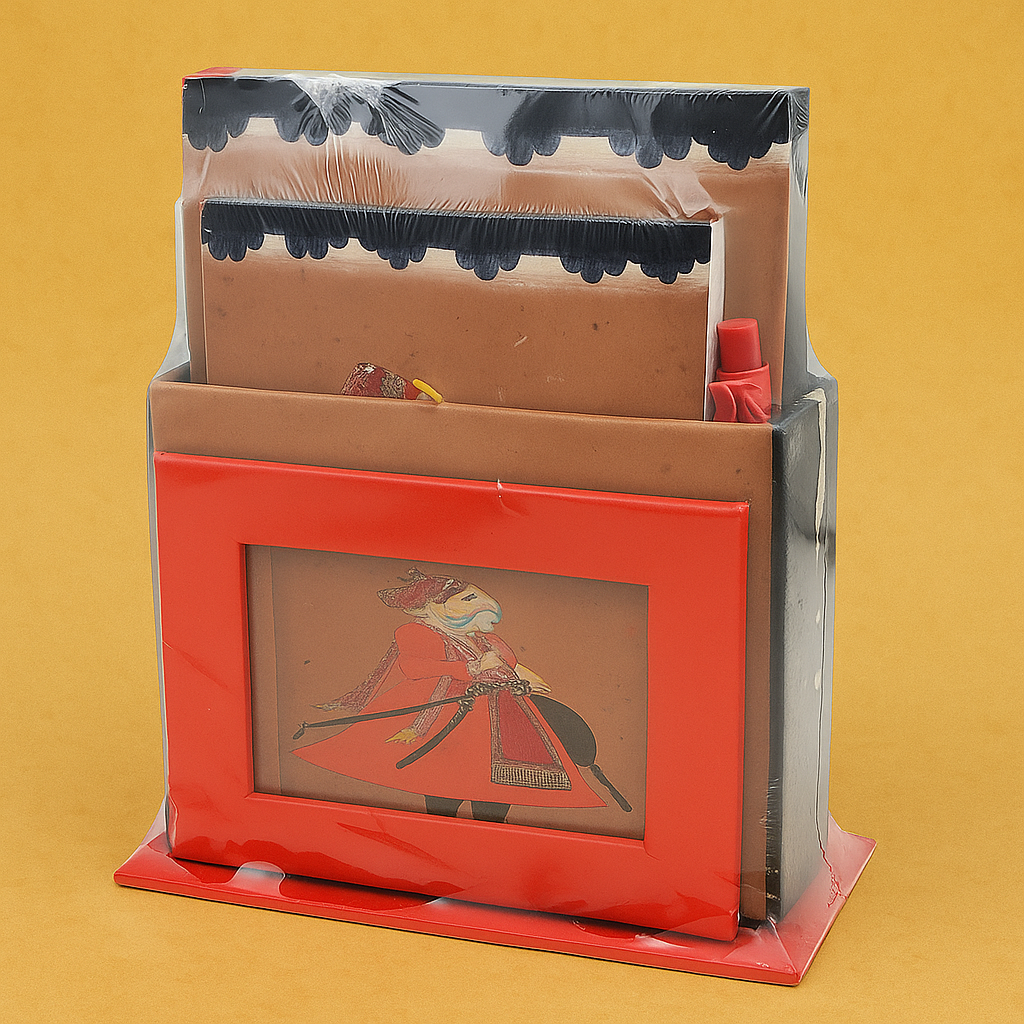 The Luxury Collection Handcrafted Rajasthani Desk Organizer is a perfect blend of tradition and functionality. Featuring exquisite Rajasthani artwork on its front panel, this organizer adds a regal touch to your workspace. Crafted with durable wood and coated in vibrant hues of red and black, it includes compartments for holding notebooks, pens, and stationery essentials — keeping your desk neat and stylish. The design captures the charm of Indian craftsmanship while serving a modern purpose.