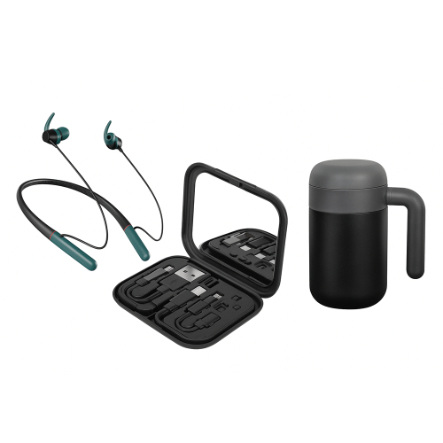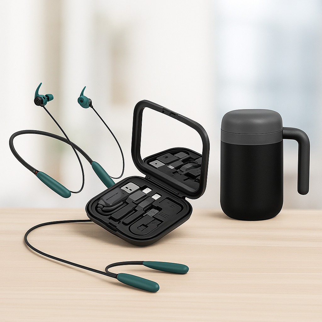 Tucked beside it is a multipurpose charging kit, neatly curated with cables and converters for every port, every device, every moment of oh no, wrong charger. Housed in a jet-black zip case that feels more designer than techie, it’s utility made desirable.