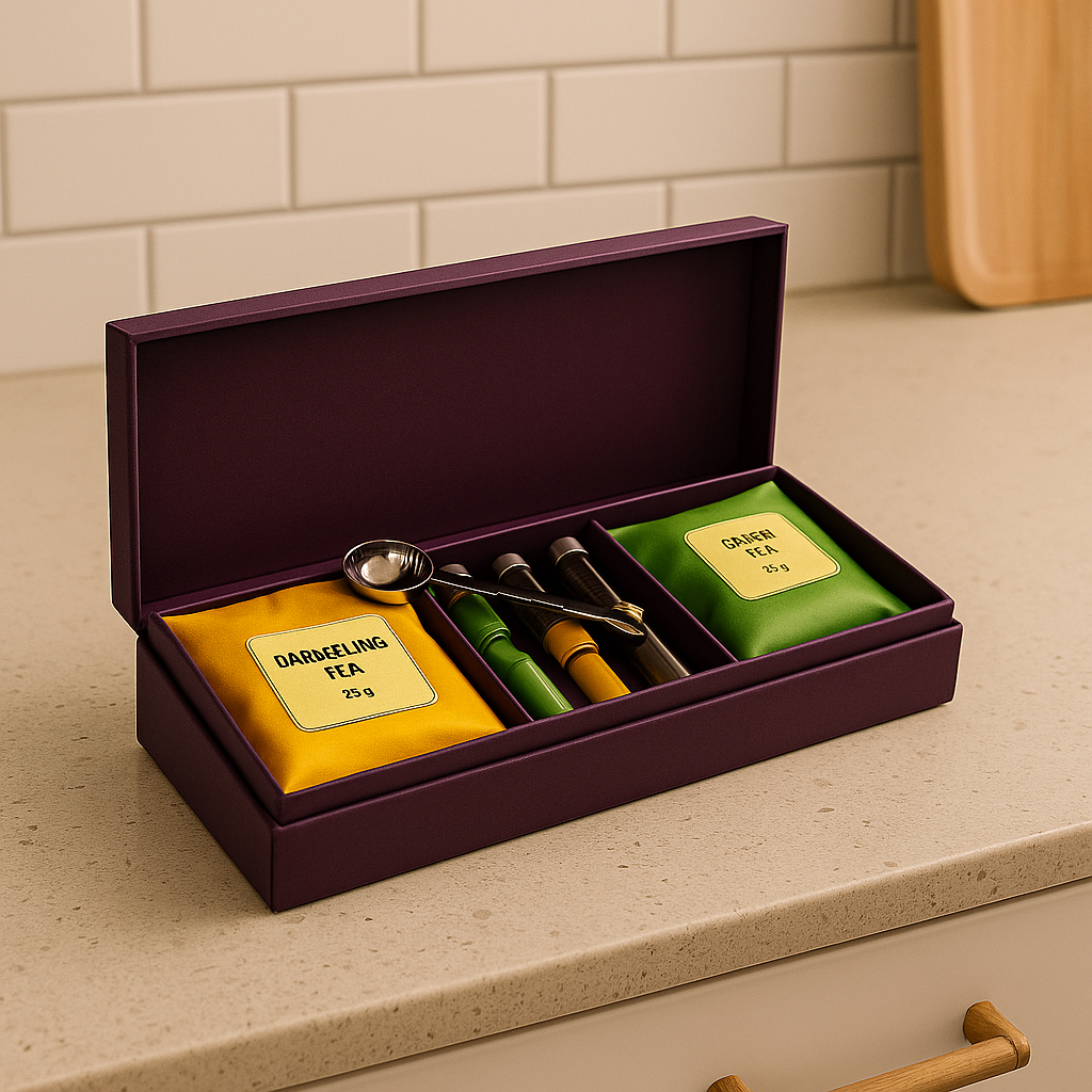 Indulge in a luxury tea experience with our Premium Tea Gift Box, a perfect balance of taste, elegance, and craftsmanship. Curated for true tea connoisseurs, this set features two exquisite blends — Darjeeling Black Tea and Green Tea, sourced from the finest estates of the Himalayas. Each variant offers a distinct flavor profile, capturing the spirit of Indian tea heritage in every cup.