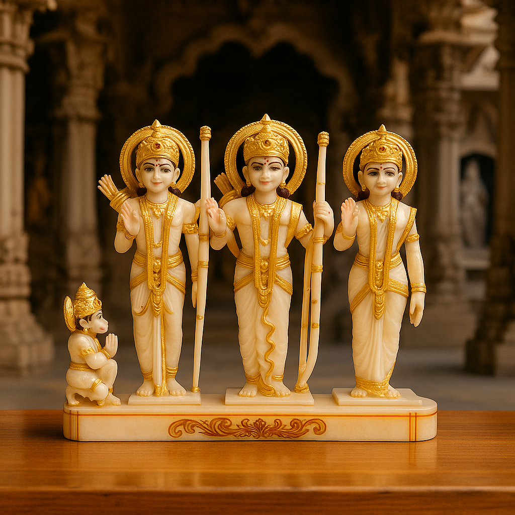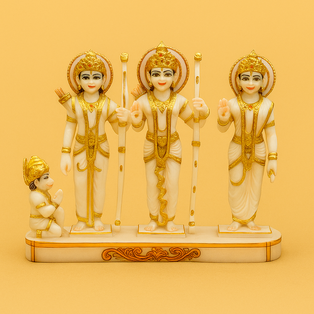 Bring divine serenity and traditional artistry into your home with this exquisite Ram Darbar Marble Idol Set. Handcrafted with intricate detailing, the set beautifully depicts Lord Ram, Goddess Sita, Lord Lakshman, and Lord Hanuman, symbolizing devotion, strength, and family harmony. Each figure is adorned with delicate gold accents that highlight their regal aura and add a spiritual radiance to any home or temple space.