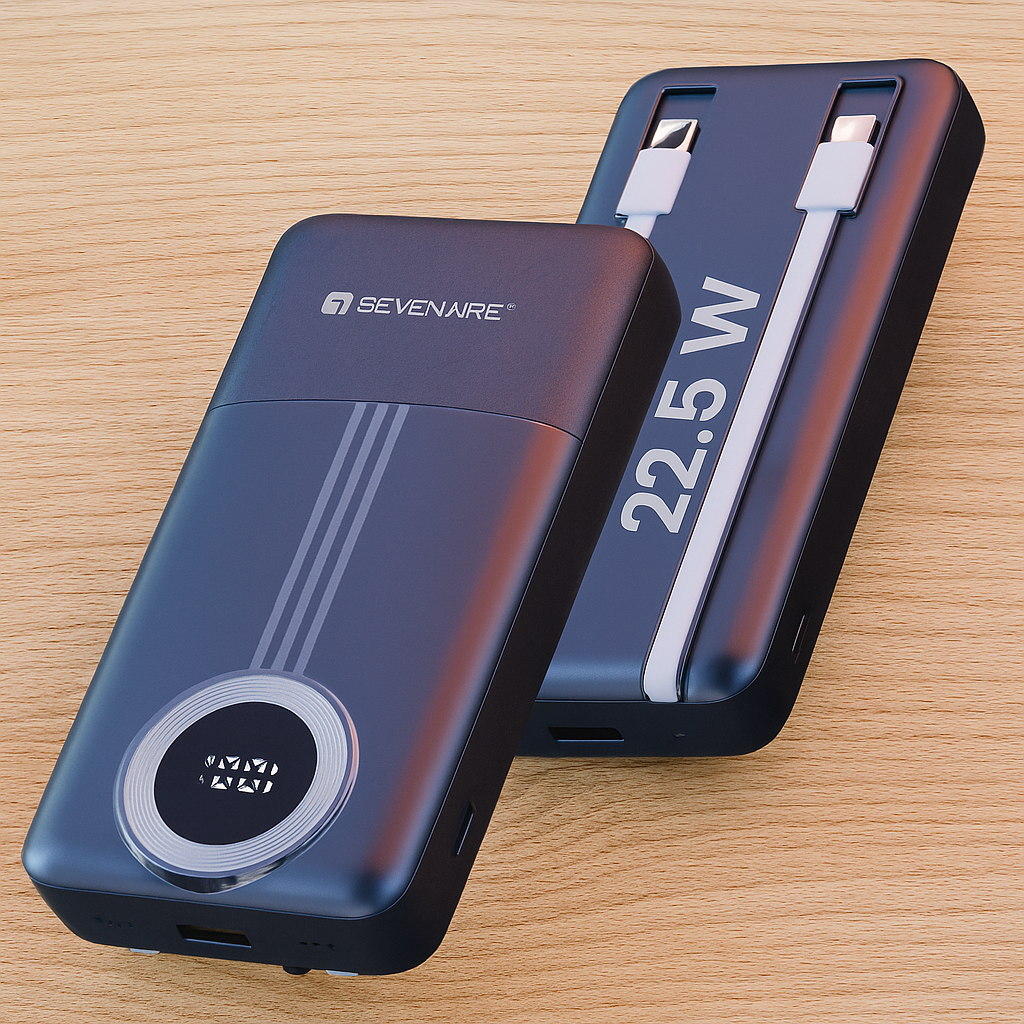 The Sevenaire 20,000 mAh Power Bank is a high-performance portable charger designed for convenience and power on the go. With built-in Type-C and Lightning cables, along with USB-A and Type-C PD output ports, it allows you to charge up to four devices simultaneously at speeds up to 22.5W. Its sleek design features a digital LED display for real-time battery status, eliminating guesswork. Ideal for travel, work, or emergencies, this all-in-one power bank ensures fast, reliable charging without the clutter of extra cables.