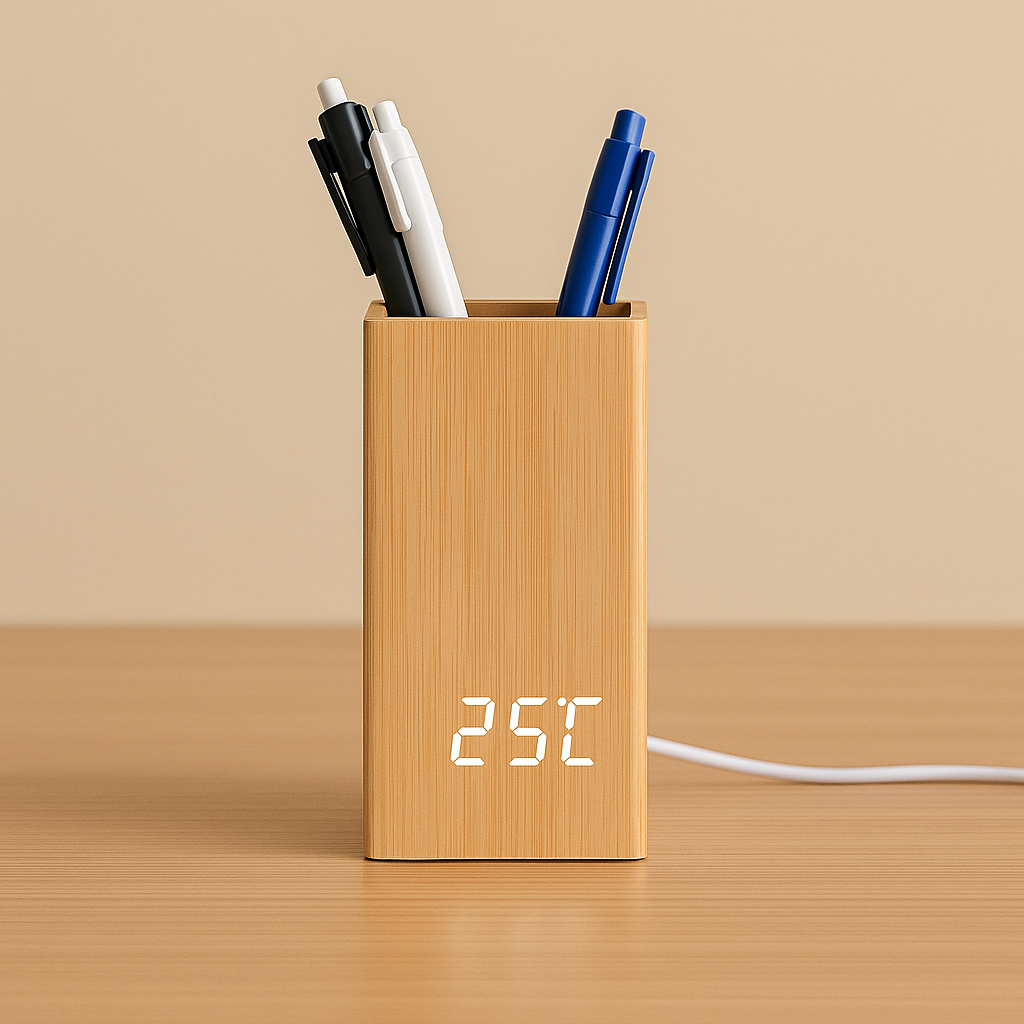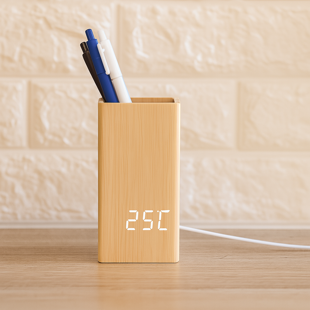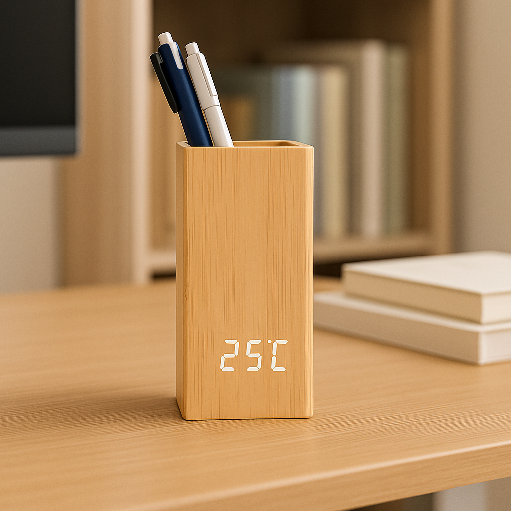 Meet the TempWood Smart Pen Holder, where functionality meets form in the most elegant way. Crafted from eco-friendly bamboo with a natural finish, this pen holder is more than just a desk organizer — it’s a smart accessory designed for the modern workspace. The embedded digital display showcases the ambient temperature, helping you stay informed and comfortable throughout your workday.