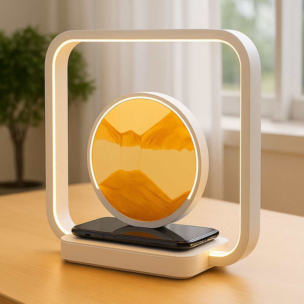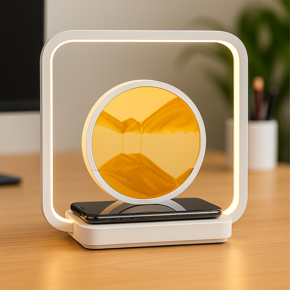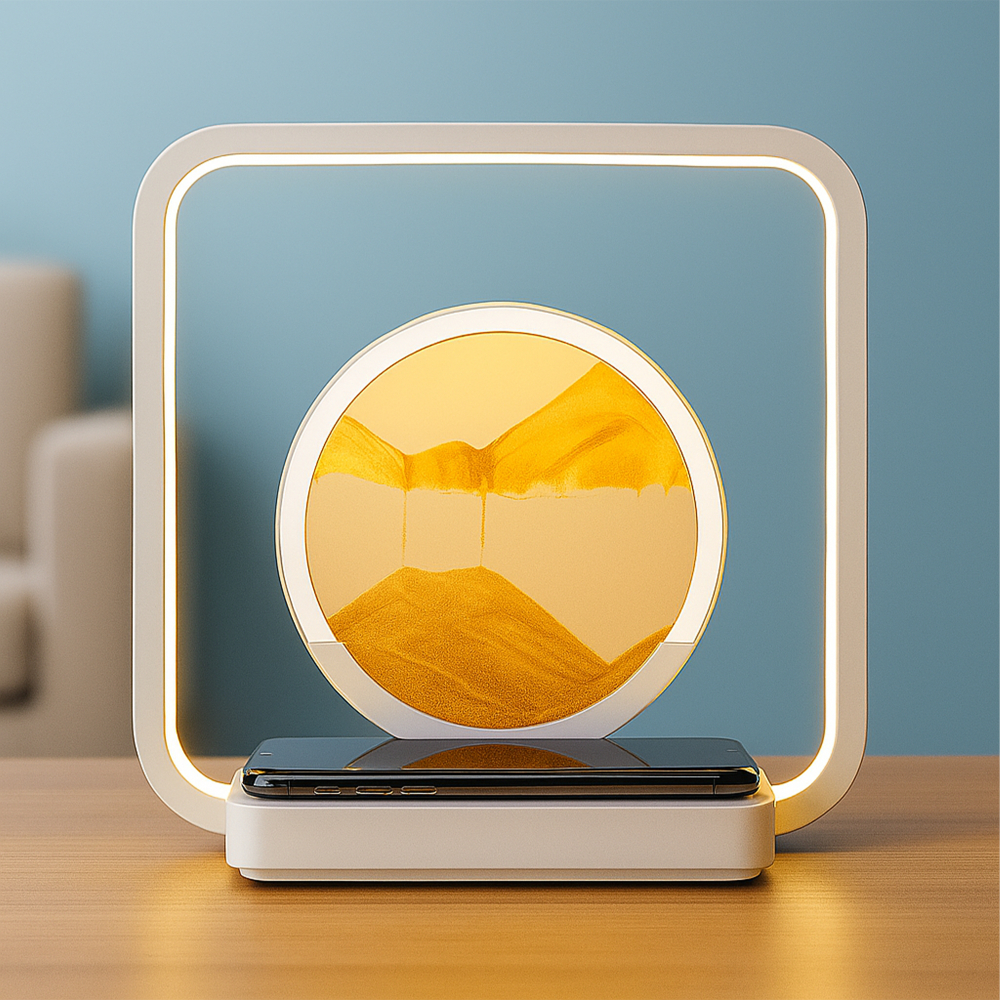 Suspended within a pristine white frame, the 3D moving sand art mimics the silent beauty of desert winds—an endless flow of amber, gold, and calm. With the warm glow of LED night lighting, it doubles as a meditative décor accent. And beneath it? The discreet power of wireless charging—15W of effortless energy, tucked beneath serenity.