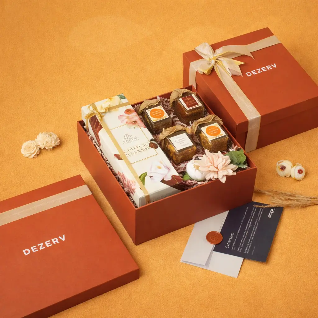 Presented in a luxurious top-and-bottom rigid box with refined detailing, the hamper delivers an elegant unboxing moment. Inside, Smoor gourmet chocolate treats offer rich indulgence, while blooming tea creates a visually stunning and calming ritual.