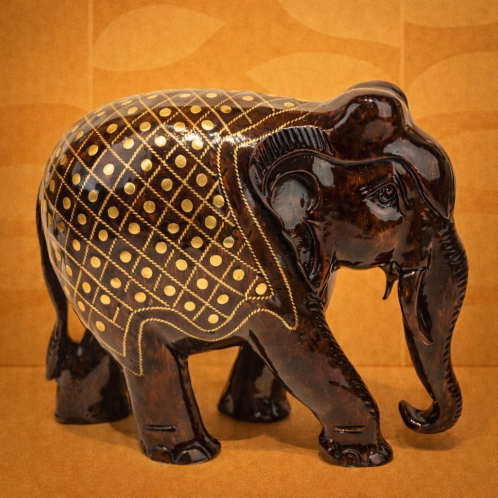 The elephant, revered as a symbol of wisdom, strength, stability, and good fortune, brings positive energy and traditional charm to any space. The warm natural tones of the wood combined with the gleaming brass inlay give this artifact a regal and timeless appeal. Each piece reflects careful workmanship, making every elephant unique.