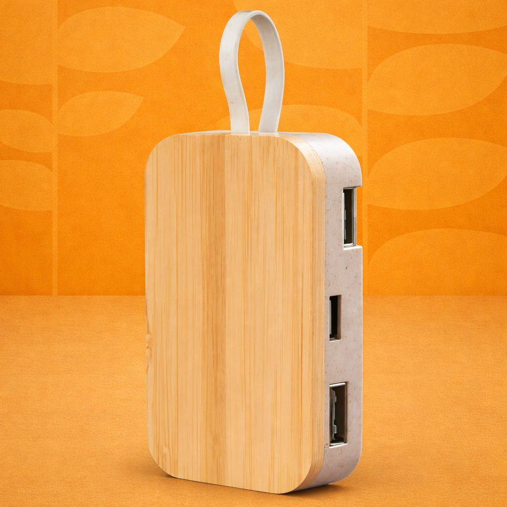 Ideal for corporate gifting, employee welcome kits, sustainable promotional campaigns, and tech accessories, the WoodHub offers multiple USB outputs for connecting devices such as flash drives, keyboards, and external hard disks. The integrated retractable mobile stand adds extra convenience, while the bamboo surface provides an excellent area for custom branding.